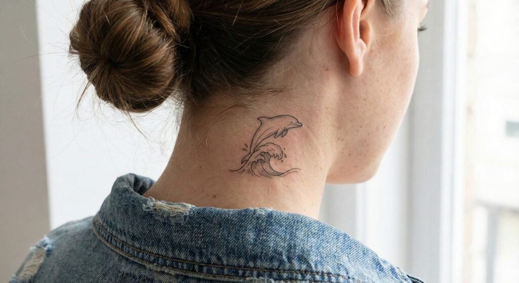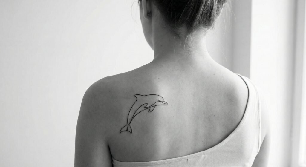 A minimalist dolphin tattoo is ideal for those who want a clean, subtle design. Using only thin, continuous lines, this style captures the dolphin’s graceful curves without heavy detail. These tattoos look beautiful on the wrist, ankle, behind the ear, or along the collarbone. Despite its simplicity, a line-art dolphin still conveys the symbolism of peace, freedom, and lighthearted energy.