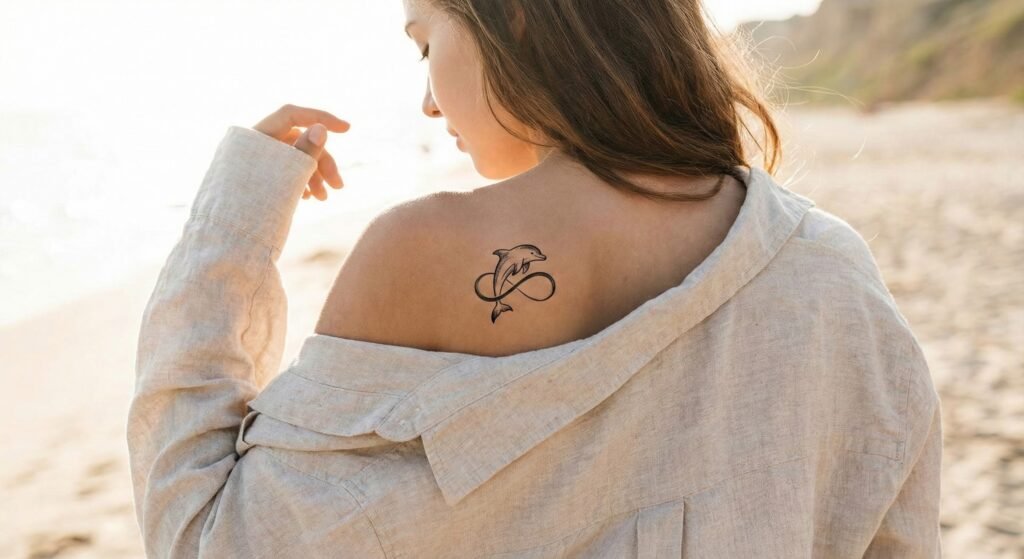 Combining a dolphin with an infinity sign creates a tattoo that symbolizes eternal love, unbreakable bonds, and endless possibilities. Some designs feature the dolphin forming part of the loop itself, while others show the dolphin leaping through the infinity shape. This idea is often chosen to represent lifelong connections, personal growth, or the belief in infinite potential.