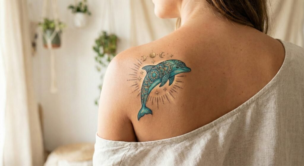 Some people view dolphins as spiritual guides or symbols of intuition and enlightenment. A mystic dolphin tattoo might include elements like mandalas, moons, stars, or sacred geometry. This style connects the dolphin to themes of energy, awareness, and inner peace. It’s a great choice for those who resonate with the ocean spiritually or want a tattoo that reflects personal transformation.