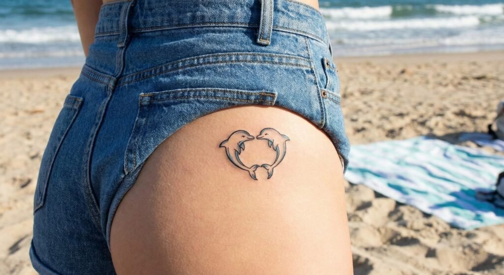 This design incorporates one or two dolphins forming a heart shape, symbolizing love, connection, and devotion. Many couples or close friends choose matching dolphin heart tattoos as a way to express their bond. The design can be playful, romantic, or artistic, depending on the style and detail. Adding small waves, bubbles, or names can make it even more personal.