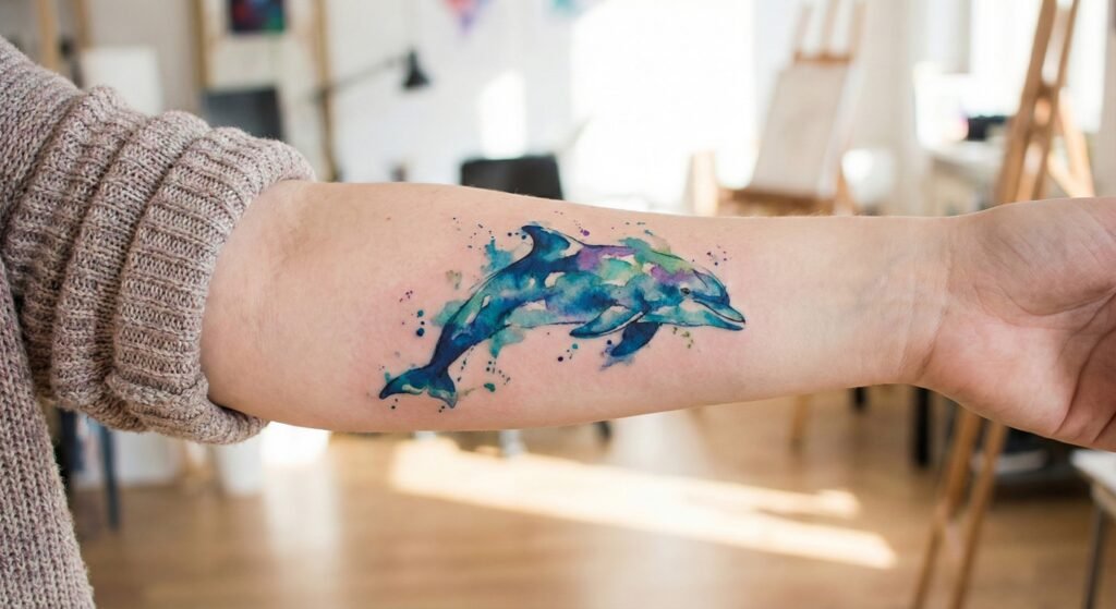 3. Watercolor Dolphin Tattoo