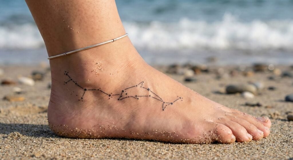 A dolphin constellation design blends celestial imagery with marine symbolism. This tattoo often uses small stars connected by fine lines to form the shape of a dolphin. It’s a meaningful option for dreamers, stargazers, or anyone who feels connected to the universe. Constellation tattoos are typically delicate and elegant, making them perfect for placements like the forearm or upper back.