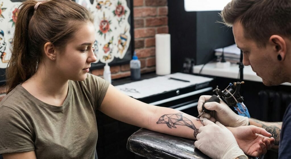 For lovers of modern art and clean symmetry, a geometric dolphin tattoo is a perfect choice. This design uses shapes such as triangles, lines, and polygons to form the dolphin’s silhouette. The result is a tattoo that feels both contemporary and symbolic, reflecting balance, structure, and creativity. Adding geometric water elements can enhance the overall effect.